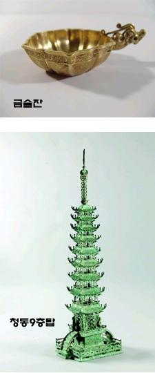 앞서 공개된 3세기 고구려시대의 벽비(壁碑·서울신문 4월12일자 보도) 이외에도 고구려와 고려시대의 국보급 유물들이 10여점이나 새로 선보이기 때문이다. 이중 가장 눈길을 모을 것으로 기대되는 것들은 고려시대에 청동으로 제작한 ‘미니어처’ 9층탑과 개성 공민왕릉에서 출토된 금술잔, 고구려시대의 도용(陶俑)과 불상, 인장 등이다.