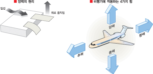 하늘을 나는 원리는 간단한 실험을 통해 확인할 수 있다. 책상 끝부분에 종이를 올려놓고 종이의 윗면에 입으로 바람을 불어주면 종이가 위로 떠오르게 된다. 이는 종이 윗면의 공기 흐름이 아랫면보다 빨라져 윗면에 작용하는 압력이 아랫면보다 작아지기 때문이다. 이때 작용하는 힘을 양력(揚力)이라고 한다.