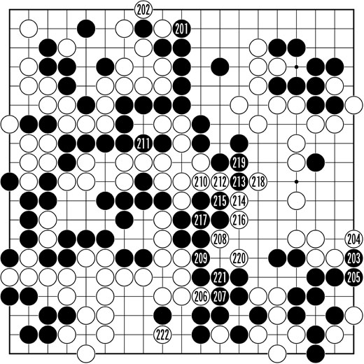 제10보(201∼222) 중앙과 좌상귀의 바꿔치기로 흑은 약간 손해를 봤지만 201을 선수하고 반상 최대인 203의 곳을 차지할 수 있었기 때문에 흑의 우세는 여전하다. 어쩌면 변수가 많이 사라진 지금이 흑의 우세가 더 확실할 수도 있다. 적어도 이창호 9단은 속으로 그렇게 생각하고 있었을 것이다.