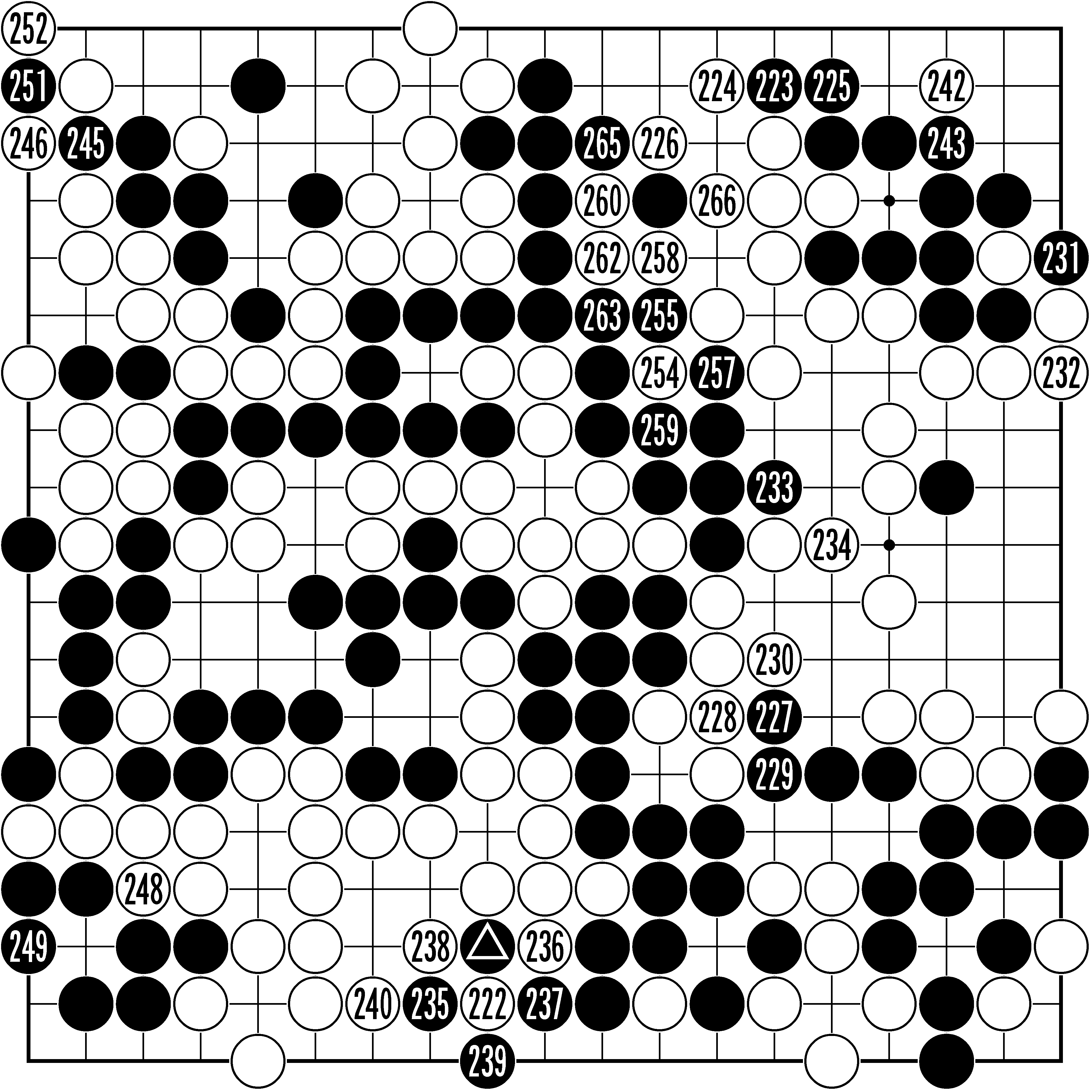 제11보(222∼267) 백 222로 붙이면서 백이 맹렬한 추격전을 벌이고 있다.‘이제 어쩌면 역전, 역전에는 미치지 못했더라도 최소한 미세한 바둑이 됐을 것이다.’두 대국자들은 아마 이렇게 생각했을 것이다.