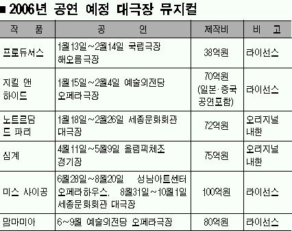 최근 2∼3년새 100만 관객,1000억원 규모로 가파른 상승세를 이어온 국내 뮤지컬 시장이 내년 빅뱅을 예고하고 있다.‘미스 사이공’‘프로듀서스’‘십계’ 등 외국 대작 뮤지컬이 줄줄이 들어오는데다 ‘렌트’‘스텀프’ 등 중소형 뮤지컬의 투어 공연도 어느 해보다 풍성하다.