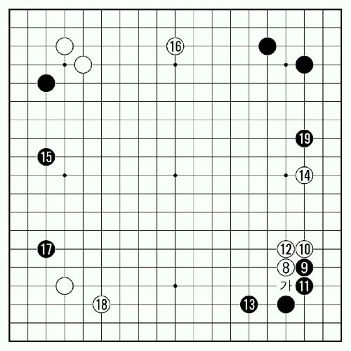 제2보(8∼19) 백 8로 높이 걸쳤을 때 흑 9의 밑붙임은 실리를 먼저 챙기겠다는 의사 표현. 우상귀 소목 굳힘을 했을 때부터 실리작전으로 나가겠다는 의사는 분명히 밝힌 셈이다. 이때 곱게 실리를 내주기 싫어 복잡한 변화로 이끌려면 가로 치받는 정석을 선택하면 된다. 그렇지만 김혜민 3단은 곱게 백 10으로 받아준다. 오랫동안 애용된 이 정석도 사실 백이 불리할 이유는 없기 때문이다.