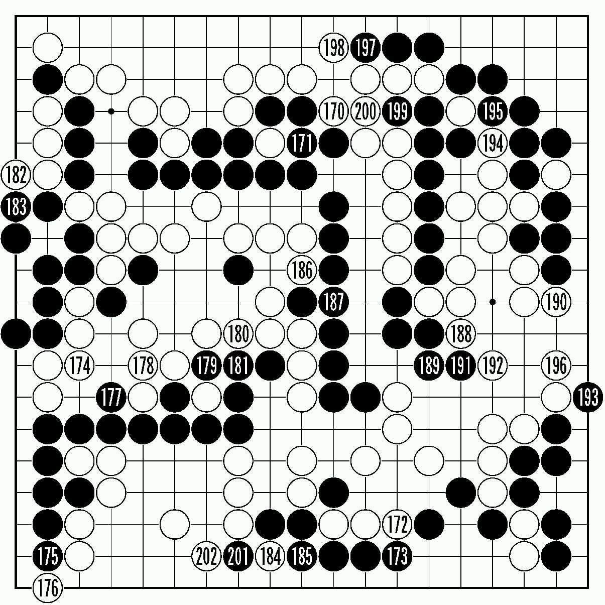 제9보(170∼202) 이미 승부는 백쪽으로 기운 지 오래 됐다. 이번 해설은 백이 유리한 바둑을 어떻게 이기는지, 그 마무리 수순을 보여주는 데에 불과할 뿐이다.백172로 치받으면 하변 백 두점을 선수로 살려올 수 있다. 그 가운데 흑 한점은 덤으로 잡혔다. 안팎으로 9집 정도의 큰 끝내기인데 이런 끝내기를 선수로 당해야 하는 것이 가슴 아프다.
