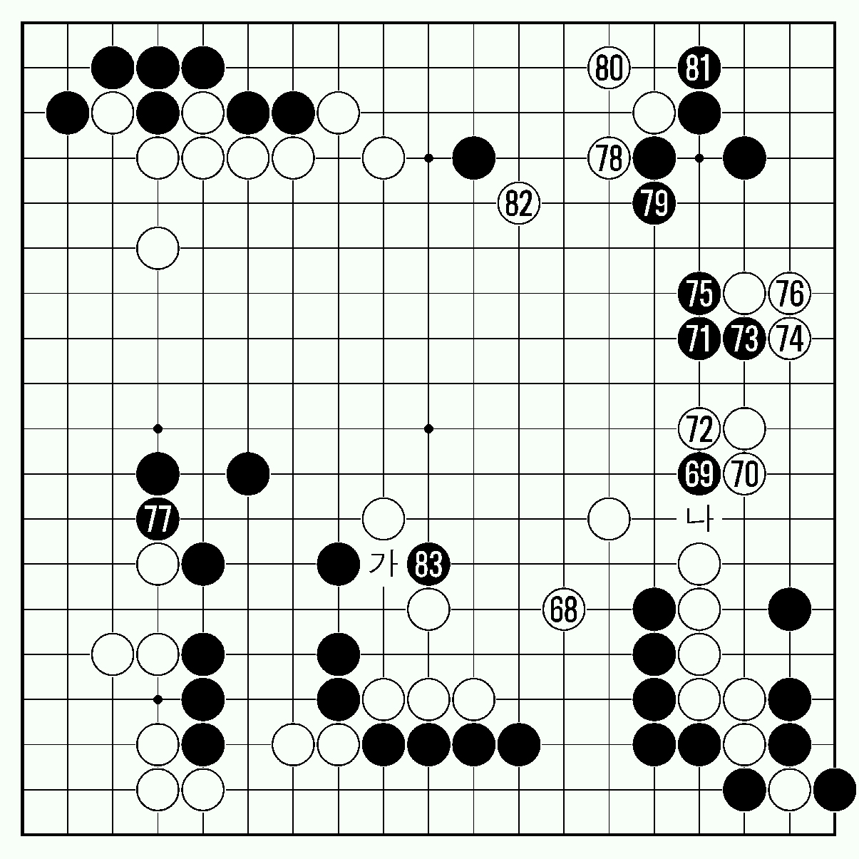 제5보(68∼83) 백68로 지키자 흑가로 나가 끊는 수가 사라져서 백의 호조로 보였다. 이때 흑69가 등장했다. 날카로운 급소 일격. 김지석 2단의 천재성이 엿보이는 장면이다.