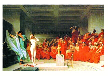 그림의 배경은 기원전 4세기 아테네의 한 법정. 아프로디테 신상(神像)의 제작 모델로 설 만큼 아름다웠던 프리네란 여인이 한 권세가의 모함에 의해 신성모독죄로 법정에 선다. 사형선고를 받을 위기의 순간, 그녀의 애인이었던 변호인은 프리네를 알몸인 채 천만 씌워 들어오게 한다. 그리고 마치 동상의 제막식을 하듯, 알몸을 덮고 있던 천을 벗겨버린다. 경악과 감탄의 탄성을 토해내는 배심원들. 변호인은 ‘자 신상에 자신의 형상을 빌려줄 만큼 아름다운 여인을 꼭 죽여야 하는가?’라고 묻는다. 결국 배심원들은 ‘사람이 만들어낸 법은 효력을 발휘할 수 없다.’란 결론을 내리고 무죄를 선고했다고 한다.