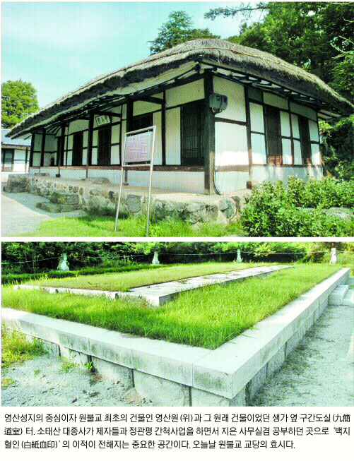 원불교 영산성지의 중심부분. 뒤쪽 둥근 초가지붕 건물이 원불교 최초의 건물 영산원이고 그 맞은편 것이 정산 종사와 가족들이 살았던 법모실이다.