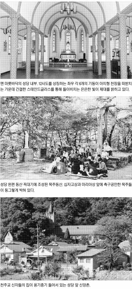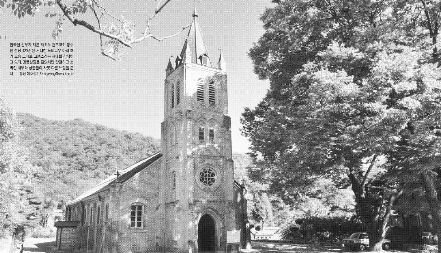 강원도 횡성군 서원면 유현2리 두메산골에 마치 한 폭의 그림처럼 고즈넉하게 들어앉은 풍수원 성당(주임신부 김승오·강원도 유형문화재 제69호). 고딕·로마네스크풍 건물이 명동성당을 축소해 옮겨놓은 듯 빼닮았지만 의자 없는 맨 마룻바닥과 간결한 내부가 100년 전 건립 때의 모습 그대로다. 자연과 잘 어울리는 고즈넉한 외양 때문에 일반인들에겐 이런저런 드라마와 영화 촬영의 단골로 애용되는 아름다운 공간이면서 한국 천주교사의 한 획을 그을 만큼 중요한 종교적 위상을 지닌 곳. 신앙촌을 터전으로 한국인 신부가 지은 최초의 성당으로, 강원도 경상도 등 한국 동부 지역의 천주교 성당과 교인을 총괄했던 ‘동부 전교의 중심지’였던 것이다.
