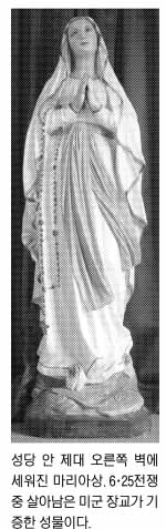 성당 건립자인 정규하 신부의 유품을 비롯해 초기 사제들이 미사때 쓰던 촛대와 의식복, 흙으로 빚은 십자가, 율무묵주, 성합, 기도서들을 눈여겨보면 이곳이 예사로운 곳이 아님을 느끼게 한다. 사제관 왼편 나지막한 동산에 조성한 십자가의 길도 꼭 둘러봐야 할 공간. 지난 2002년 판화작가 이철수씨가 예수 최후의 고난상들을 동판화로 제작한 14처를 음미하며 정상에 오르면 잘 꾸며진 묵주동산을 만나게 된다. 나란히 선 큰 십자고상과 마리아상 앞에 축구공 크기만 한 묵주알들이 빙 둘러 박혀 있는 게 특이하다.