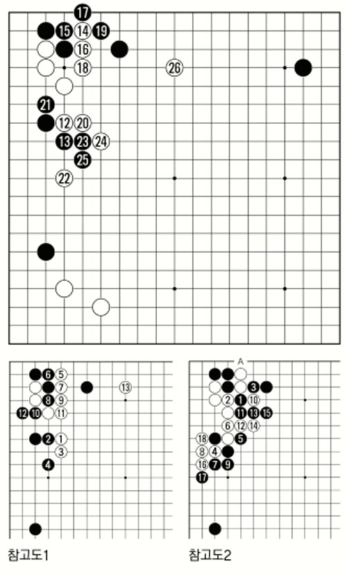 제2보(12∼26) 백12의 붙임은 최근 (참고도1) 백1과 같이 날일자로 두는 수가 유행이다. 이 수는 몇년 전에도 두어졌고, 그때 흑은 이 수에 대한 마땅한 대응수단이 없어서 고전했다. 그런데 흑2로 치받고 4로 한칸 뛰는 수가 새롭게 개발됐다.