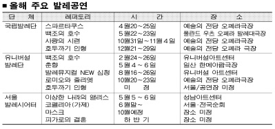 발레 팬이 눈에 띄게 늘어나면서 각 발레 단체가 팬들의 기호에 맞춘 레퍼토리 개발에 고심하고 있다. 그래서인지 새해 발레 무대엔 색다른 신작들이 대거 올려질 전망이다. 이 가운데서도 국내 발레계를 움직이는 국립발레단과 유니버설발레단, 서울발레시어터 등 3개 발레단체는 새해를 발레 도약과 중흥의 해로 삼아 야심작들을 잇따라 내놓을 채비를 하고 있다.3개 단체를 중심으로 올해 발레계의 흐름과 눈에 띄는 레퍼토리를 짚어본다.