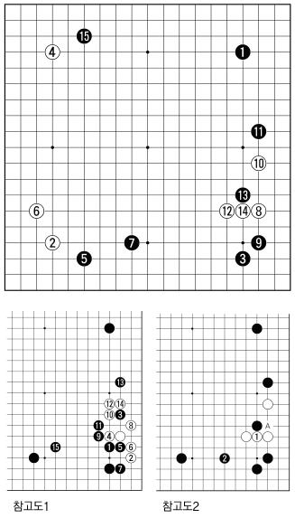 백8의 걸침에 대해 흑이 9로 응수한 것은 가장 온건한 수법. 급전을 피해 장기전으로 국면을 이끌겠다는 뜻이다. 좀더 적극적으로 판을 짜고 싶다면 흑은 <참고도1> 흑1처럼 둘 수도 있다. 이하 15까지가 정형화된 수순. 한참이나 유행을 타던 소위 포석의 정석인데 어느새 자취를 감추었다. 최근에는 다시 실전과 같은 형태로 복귀하고 있다.