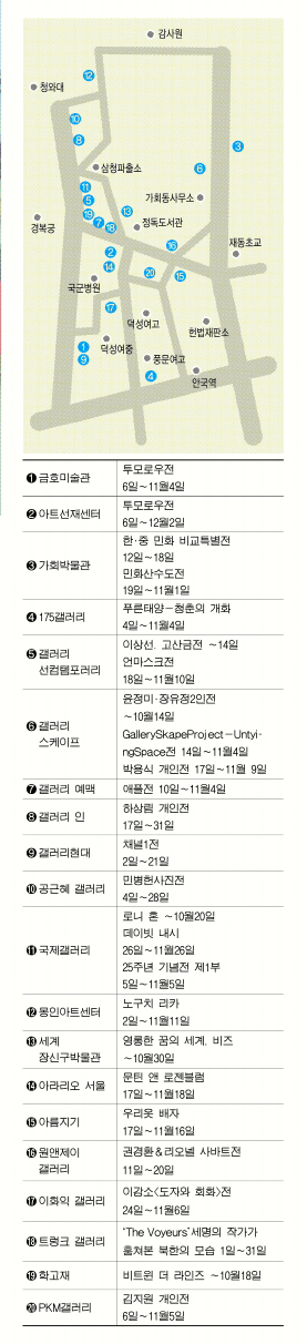 북촌예술제가 열리는 동안 작가와의 대화, 필름 상영회 등이 함께 진행되며, 목∼토요일에는 밤 9시까지 전시장이 연장 개관된다. 야트막한 한옥 지붕 사이 골목골목을 누비며 최첨단 현대미술을 감상하는 재미가 쏠쏠하다.(02)739-7098.