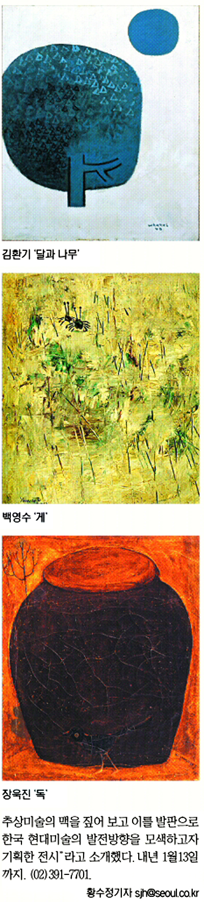 환기미술관 채영 학예연구원은 “한국 추상미술의 맥을 짚어 보고 이를 발판으로 한국 현대미술의 발전방향을 모색하고자 기획한 전시”라고 소개했다. 내년 1월13일까지.(02)391-7701.