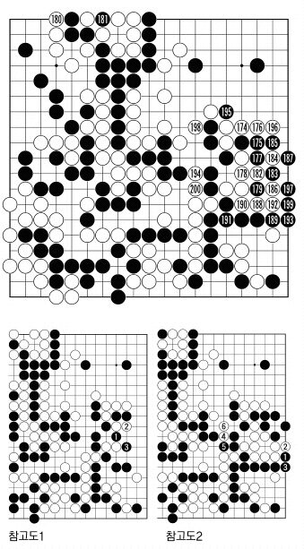 흑193은 〈참고도2〉 흑1로 젖히는 것이 수상전에 도움이 될 듯하지만 백이 2로 막은 뒤 4로 끼우면 실전과 거의 비슷한 결과가 된다. 오히려 흑이 건너가는 맛을 없앤 만큼 손해다. 백200으로 중앙 흑이 모두 잡힌 상황에서는 승부도 확실히 결정되었다. 이후의 수순은 총보로 미룬다.