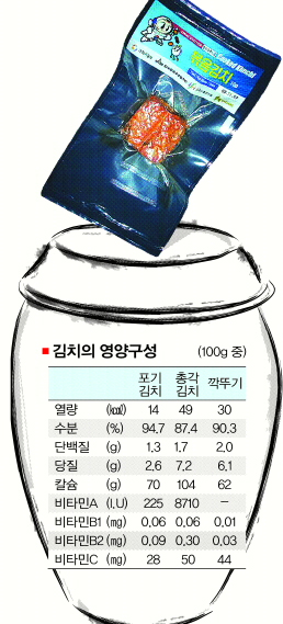 식품 전문가들은 김치를 담그는 전과정이 웰빙 그 자체라고 설명한다. 김치의 주원료인 배추·무 등의 채소는 대장암 예방효과가 입증돼 있다. 마늘은 위암 예방에 효과적이고, 고춧가루는 매운 맛을 내는 캡사이신 성분이 위액의 분비를 촉진시켜 소화 작용을 돕는다. 익히거나 찌는 등의 가열 절차가 없기 때문에 비타민A와 C의 함유량이 많아 대표적인 항산화음식으로 꼽힌다. 생강의 주성분인 진저롤은 식욕증진과 혈액순환에 효과적이다. 동물성 젓갈에서 아미노산을 얻어 쌀을 비롯한 곡물류에서 부족한 단백질을 보완할 수 있으며, 김치가 익으면서 젓갈의 뼈도 녹기 때문에 칼슘의 공급원이 된다.