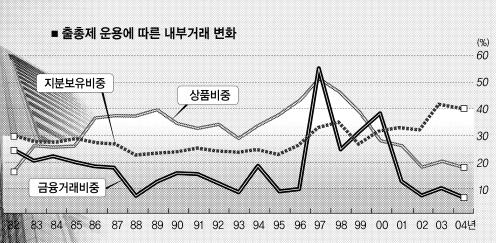 이 교수팀의 분석결과에 따르면, 출총제 도입 및 폐지 여부에 따라 기업간 내부거래는 큰 차이를 보였다. 출총제가 도입된 87년과 출자한도를 40%에서 25%로 축소해 규제를 강화한 94년, 외환위기 직후 출총제를 폐지한 98년 전후로 내부거래 비율이 크게 요동쳤다. 기업간 금융거래는 82년 24.06%로 정점에 달했다가 87년 이후 지속적으로 하락해 94년 전후엔 한 자릿수로 떨어졌고, 97년 53.36%로 급증했다.85년 27.73%로 최고치를 기록한 계열사간 지분보유 또한 87년 이후 조금씩 감소해 95년 21.95%로 조사기간 중 가장 낮은 수치를 나타냈고,98년 다시 34.13%로 높아졌다. 이 교수팀은 “내부거래가 급증한 시기는 98년 2월부터 2001년 3월까지 외환위기로 출총제가 한시적으로 폐지되는 시점과 일치한다.”며 등락 원인을 분석했다. 이 같은 내부거래 변화는 기업간 순환출자에 힘입은 ‘소수자 통제형 소유구조’의 완성과도 맥을 같이한다.70년대 후반에서 80년대 초반까지 30대 재벌과 비재벌(30대 재벌 이외 기업) 모두 대주주 지분이 20%가 넘고 계열사 보유 지분은 미미했다. 반면 80년대 말 이후부터는 대주주 평균 지분은 10%대로 떨어졌지만, 계열사 평균 지분은 순환출자를 통해 30% 이상으로 상승했다. 이 교수팀은 “한국기업 소유구조의 가장 중요한 변화는 80년대 중반 이후 재벌계 대기업을 중심으로 대주주가 적은 지분을 소유하면서도 계열사 지분의 도움으로 거대한 기업집단을 통제해 가는 ‘소수자 통제형 기업’의 출현”이라고 지적했다. 출총제를 폐지하더라도 적절한 보완책이 필요함을 시사하는 대목이다.