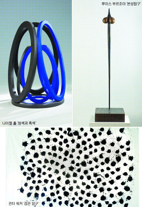 칼 조각을 내놨던 귄터 워커는 5m가 넘는 방대한 천 작품, 시멘트 벽돌을 쌓아 입방형 모서리를 표현했던 솔 르윗은 미니멀리즘을 보여주는 소품 드로잉들로 작품세계의 스펙트럼이 어떻게 확장돼 왔는지 웅변한다. 리움미술관, 신세계백화점 본점 옥상의 거미 작품으로 더 친숙한 루이스 부르조아도 꼭 챙겨볼 작가다. 제4전시실에 드로잉 14점과 조각 1점이 소개됐다.