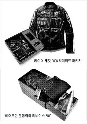 가장 최근 재미를 본 업체는 레포츠 캐주얼 브랜드 EXR. 이달 초 라이더 재킷을 선보이면서 55개 특별 한정판으로 ‘라이더 재킷 2008 리미티드 패키지’를 선보였다. 선착순 55명만 구입을 허락한 이 패키지는 사전 예약을 실시했고 출시 후 3일 만에 모두 판매되는 기록을 세웠다. 고급스러운 검정색 박스에 재킷과 함께 특별 제작된 차량 번호판용 볼트, 차량용 카드 홀더 등을 담았다. 소장 가치를 높여 45만원이 넘는 가격에 대한 저항감을 쉽게 무너뜨렸다. 지금도 추가 발매 요구 전화가 끊이지 않고 있다고.