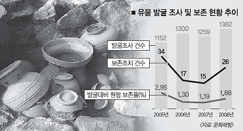 2008년 진행된 1382건의 발굴조사 중 현장의 원형 보존이 이뤄진 곳은 26곳, 1.88%에 불과한 것으로 나타났다. 최근 3년 동안을 따져봐도 원형 보존 비율은 1%대를 벗어나지 못하고 있다. ‘매장 문화재가 개발의 걸림돌’이라는 주장은 일단 근거가 취약한 것으로 드러난 셈이다.