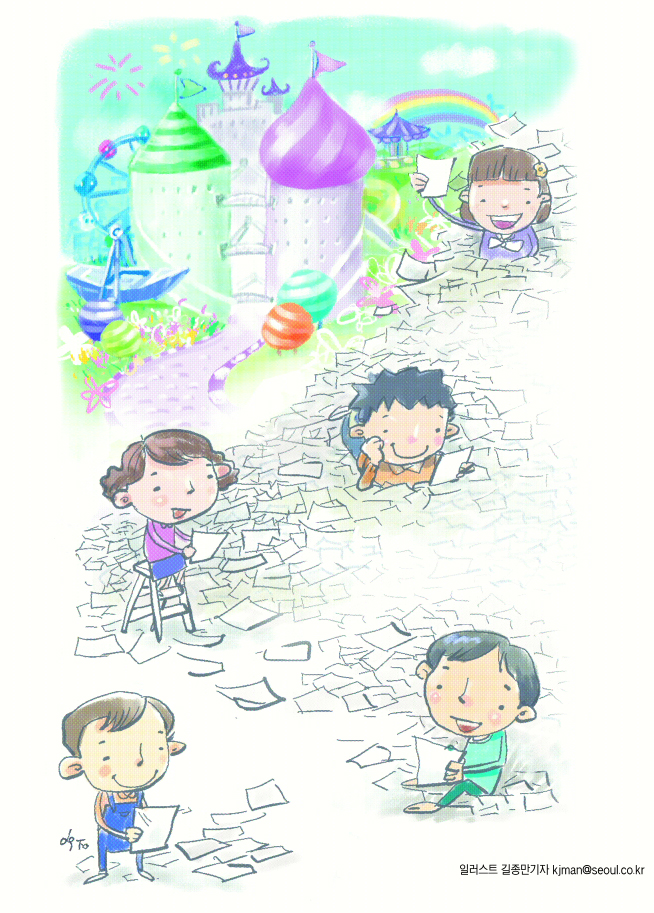 다음 날 아이들의 심사에서 뽑힌 90편의 삼행시가 발표되었습니다. 그런데 참으로 이상했습니다. 유명한 시인에게 부탁한 사람들이나 학원을 다니면서 삼행시를 열심히 공부한 사람, 그리고 이름을 지어 주듯이 삼행시를 지어 주는 곳에서 지은 사람들의 삼행시는 한 편도 뽑히지 않았습니다. 물론 아파트에 사는 사람으로 뽑히기 위해서 아이들을 사랑하는 마음도 없이 아이들을 입양한 사람들의 삼행시도 뽑힐 리가 없었습니다.