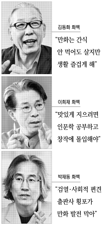 한국 만화 100주년이다. 일반적으로 1909년 6월2일 대한민보 창간호 1면에 실린 이도영 화백의 시사만화를 한국 근대 만화의 출발점으로 본다. 한국 만화는 100주년을 맞아 새로운 100년을 향한 도약을 꿈꾸고 있다. 관련행사도 다채롭게 열린다. 시대의 흐름과 함께 호흡하며 자신의 자리를 묵묵히 지켜왔던 김동화(59) 화백, 이희재(57) 화백, 박재동(56) 화백이 지난 20일 남산 자락의 서울애니메이션 센터 인근 찻집에서 한국 만화가 걸어온 길과 앞으로 가야 할 길에 대해 이야기를 나눴다.