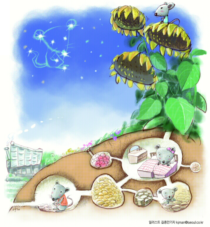 몇 년 후부터 생쥐 가족에게는 이상한 버릇이 생겼습니다. 밤마다 해바라기의 대궁을 타고 꽃에 올라가 하늘을 보며 막내 닮은 별을 찾곤 했습니다. 생쥐네 꽃밭에는 해가 갈수록 해바라기 수가 자꾸 늘어만 갔습니다.
