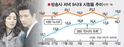 그러나 ‘뉴스9’과의 경쟁에서는 계속 뒤처졌다. 최근 여주인공의 복수에 이어 남자 주인공의 복수에 가속도가 붙으면서 시청률이 상승하기 시작한 ‘천사의 유혹’은 결국 ‘뉴스9’도 제쳤다.
