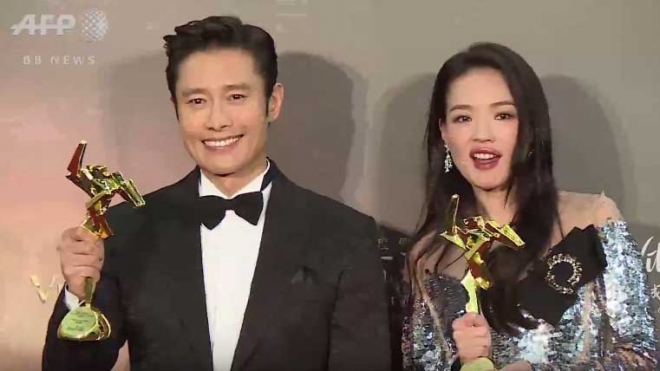 17일(현지시간) 마카오에서 열린 제10회 아시안필름어워즈(AFA)에서 남녀 주연상을 수상한 이병헌과 서기(중국)가 트로피를 들고 함께 기념촬영을 하고 있다.(AFPBB News, 유튜브 캡처)