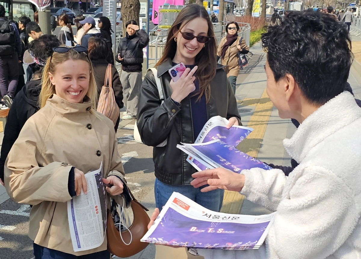 방탄소년단(BTS)의 광화문 컴백공연을 하루 앞 둔 20일 서울시 중구 태평로 서울신문사 앞에서 호외로 제작된 서울신문 BTS 특별판을 외국인들과 시민들이 받아가고 있다.