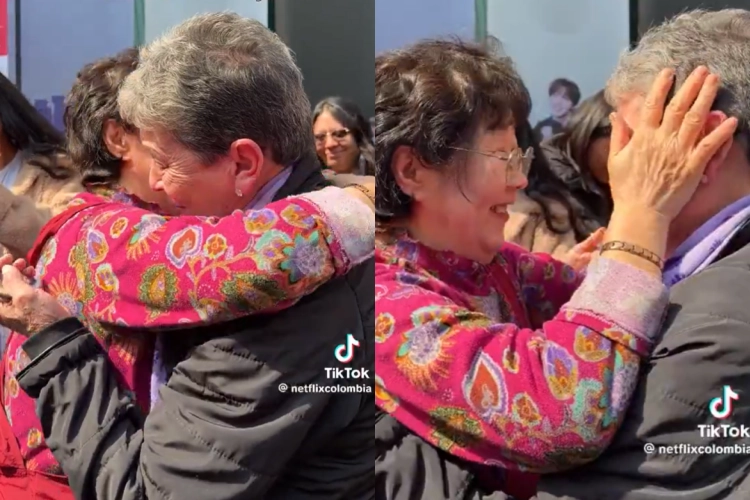 그룹 방탄소년단(BTS) 컴백 공연을 보기 위해 한국에 온 60대 콜롬비아 여성(오른쪽)이 BTS ‘성지’인 한 식당에서 사장과 포옹을 나누고 있는 모습. 넷플릭스콜롬비아 틱톡 캡처
