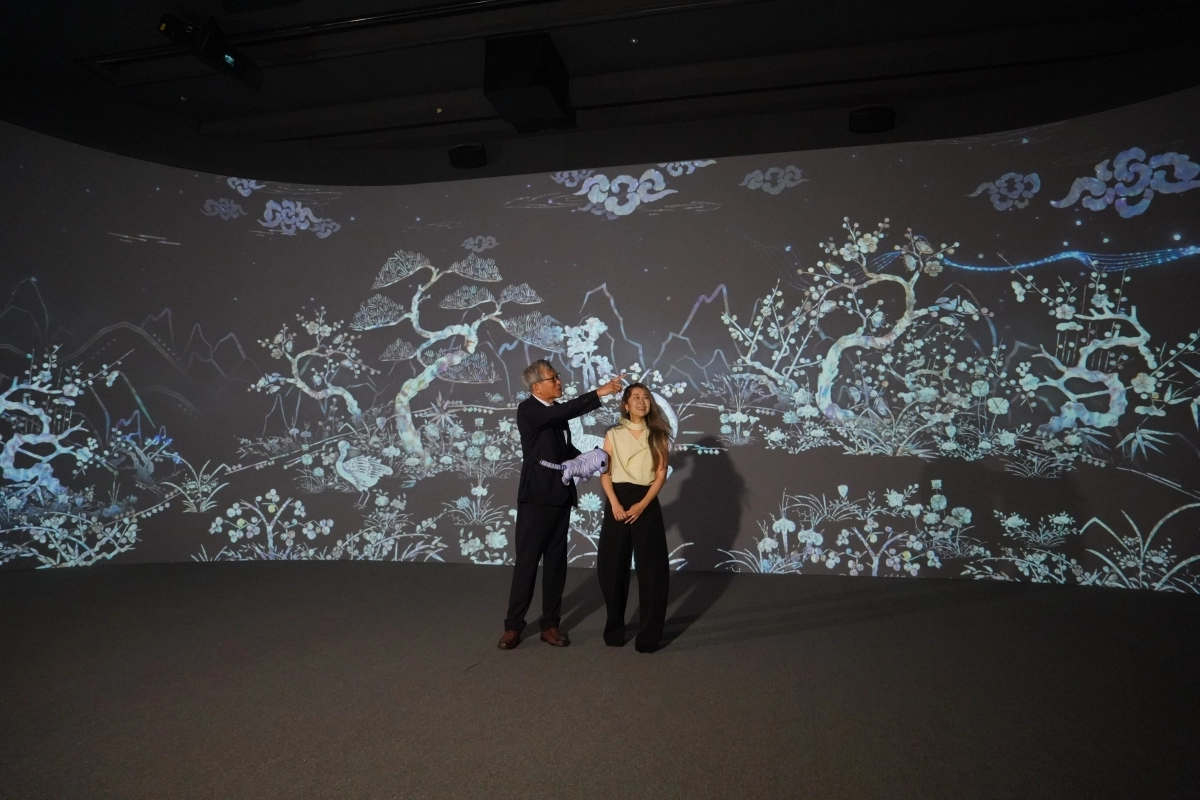 유홍준(왼쪽) 국립중앙박물관 관장이 영화 ‘케이팝 데몬 헌터스’ 매기 강 감독과 지난해 서울 용산구 국립중앙박물관의 디지털 실감영상관을 관람하는 모습.