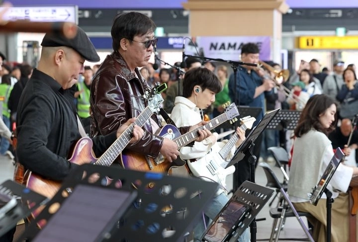최휘영(왼쪽 두 번째) 문화체육관광부 장관이 1일 ‘문화가 있는 날’의 매주 수요일 확대 시행을 기념해 서울역에서 열린 ‘수요일은 문화요일, 문화로 놀자!’ 공연에서 기타 연주를 하고 있다.