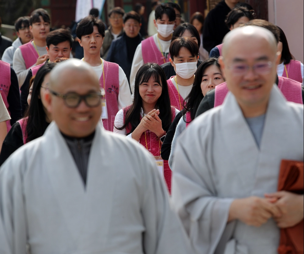 대한불교조계종 사회복지재단이 30대 미혼 남녀 20명을 대상으로 6일 인천 강화군 소재 전등사에서 실시한 1박2일 일정의 템플스테이 ‘나는 절로’에서 남녀 참가자들이 스님들과 이동하고 있다. 2024.4.7 연합뉴스