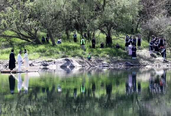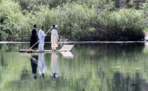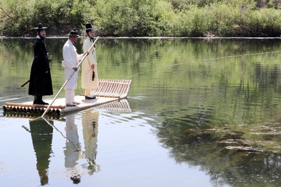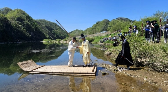 영월군과 영월문화관광재단은 올해로 제59회째인 단종문화제 첫날을 맞아 단종이 노산군으로 강봉된 채 나룻배를 타고 가시울타리인 위리안치와 같은 청령포로 들어가는 569년 전의 단종유배길 행사를 24일 재현했다.