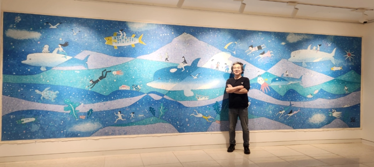 ‘고래 화가’ 김품창 작가가 29일부터 세종뮤지움갤러리 1관에서 열리는 제주 25년 회고전에서 7~8m 대작 앞에서 포즈를 취하고 있다. 작가 제공
