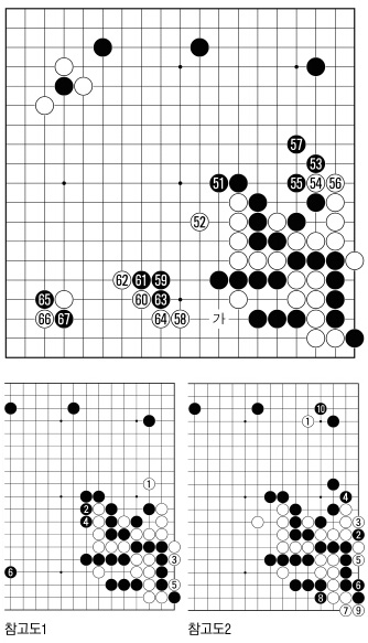 흑53의 한칸 뜀도 선수나 다름없는 수이다.(참고도2) 백1로 걸친다든지 손을 빼서 다른 곳에 두면 흑2로 먹여치고 4로 막는 수가 선수이다. 백5부터 백이 두어도 겨우 한수 차이로 흑돌을 잡을 수 있으므로 흑4에는 손을 뺄 엄두도 낼 수 없다. 결국 흑53은 이른바 후수의 선수이다. 그래서 우변 흑진을 굳혀주는 의미가 있더라도 백54로 끼워 이은 것이다.