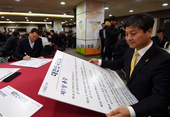 29일 서울 성북구청에서 열린 종무식에서 김영배 구청장을 비롯한 참석자들이 헌법을 바로 알고 국민을 위해 헌신 하자며 헌법을 필사하고 있다.박윤슬 기자 seul@seoul.co.kr