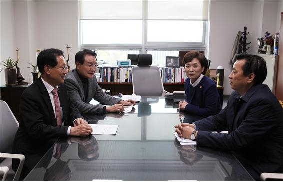 더불어민주당 충북지역 국회의원들이 29일 김현미 국토교통부 장관을 만나 KTX세종역 신설 요구 등의 부당함을 설명하고 있다.