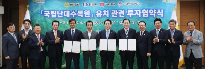 전남도가 4일 완도 ‘국립난대수목원’ 유치의 초석이 될 리조트, 호텔 분야 2개 기업과 2000억원 규모, 400명의 일자리를 창출할 투자협약을 체결했다.