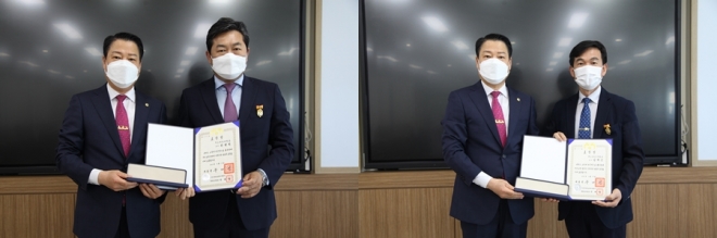 목포해양대학교 기관시스템공학부 한원희·남택근(오른쪽) 교수가 제40회 스승의 날을 맞아 대통령 표창장을 받았다. 맨 왼쪽은 박성현 목포해양대 총장