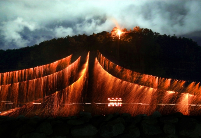 한국을 대표하는 전통 불놀이인 안동 하회마을 선유줄 불놀이. 안동시 제공