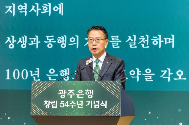 송종욱 광주은행장이 최근 본점에서 열린 창립 54주년 기념식에서 기념사를 하고 있다. 광주은행 제공