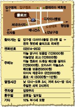그래서 분위기는 세련된 강남형에,가격은 부담없는 강북형이다.비즈 커튼방은 로맨틱하게,일본식 다다미방은 편안하게,쿠션이 있는 작은 방은 아늑하게 꾸몄다.가격은 9500원에서 2만원선으로 양에 비해 저렴하다.100여종의 와인은 주변의 다른 집에 비해 가격 거품을 뺐다.런치세트(낮 12시∼오후 2시30분)는 일반 메뉴의 양과 질을 그대로 가격만 낮췄다.1만 3000∼3만 2000원.