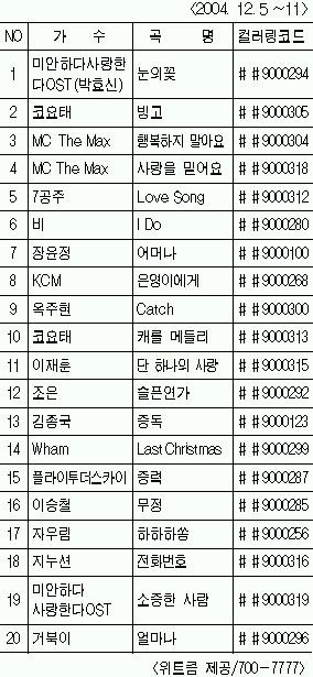 ‘MC The Max’의 ‘사랑을 믿어요’를 컬러링으로 다운받으려면, 휴대전화에서 ‘##90’과 코드번호 5자리 ‘00318’을 누르고 통화버튼을 누르면 된다.