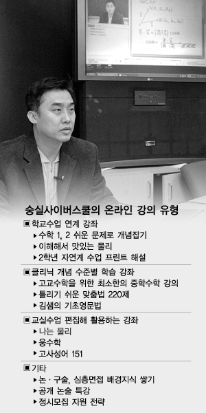 서울 은평구 숭실고등학교가 온라인과 오프라인을 연계한 e러닝을 시도해 눈길을 끌고 있다. 지난 2월 문을 연 ‘숭실사이버스쿨(soongsil.net)’은 교사들이 직접 만든 동영상 강의를 탑재, 학교 수업을 보충하고 학생 수준에 맞는 학습을 지원하고 있다.