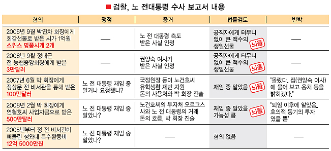 검찰이 보고서를 작성하면서 가장 공을 들인 부분은 ‘쟁점과 증거관계’다. 노 전 대통령은 재임 중 자신의 주변으로 돈이 흘러왔다는 사실관계에 대해선 인정하면서도 하나같이 “몰랐다.” “뒤늦게 알았다.”고 일관되게 주장했기 때문이다.