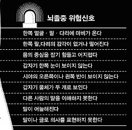 뇌졸중의 대표적인 위험신호는 ▲신체 한쪽의 부분 마비 ▲신체 한쪽의 감각 이상 ▲어지럼증 및 보행장애 ▲시야 장애 ▲한쪽 눈의 시력저하 ▲사물이 겹쳐 보이는 복시 ▲다른 사람의 말을 이해하지 못함 ▲어눌한 말 ▲언어를 통한 표현력 저하 등 9개 증상이다.