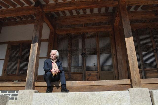 전시 오픈에 맞춰 한국을 찾은 이탈리아 조각의 거장 노벨로 피노티가 부암동 서울미술관 야외 공간인 석파정의 한옥마루에 앉아 포즈를 취했다. 피노티는 “이번 전시를 통해 관람객들이 이탈리아의 정취를 느꼈으면 한다”고 말했다.