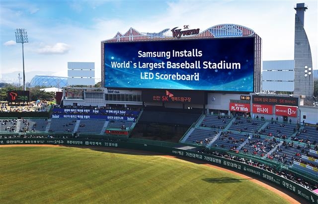 삼성전자는 프로야구 SK와이번스의 홈구장인 인천 문학동 SK행복드림 야구장에 가로 63.398m, 세로 17.962m의 세계 최대 발광다이오드(LED) 전광판을 설치했다고 3일 밝혔다. 삼성 스마트 LED 사이니지 제품으로 방진, 방수 기능을 갖추고 영하 40도에서 영상 55도까지 가동이 가능해 사계절 내내 쓸 수 있다는 설명이다.