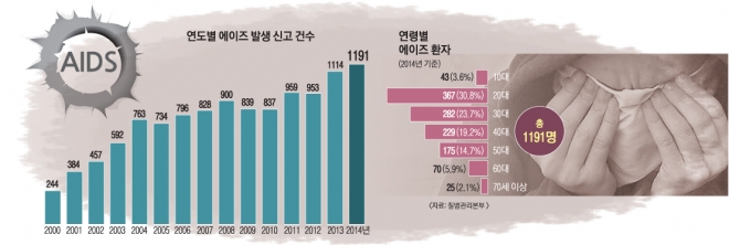 한동안 관심에서 멀어졌지만 우리나라는 아직도 한 해 에이즈 환자들이 1000명 넘게 발생하고 있다. 2014년 한 해에만 1191명의 신규 환자가 발생했다. 이 가운데 1081명이 내국인이다. 연령별로는 20대가 30.8%(367명)로 가장 많고, 30대 23.7%(282명), 40대 19.2%(229명) 순으로 20~40대가 전체의 73.7%를 차지한다. 1985년 첫 에이즈 환자가 신고되고서 30여년간 환자 수가 꾸준히 증가해 왔으며, 2013년 1000명대에 접어들었다. 없어지기는커녕 오히려 환자가 늘어난 것이다. 다만 탁월한 치료제가 많이 개발되면서 이제는 죽음에 이르는 질병이 아니라 치료와 관리를 제대로 하면 얼마든지 건강한 삶을 살 수 있는 질병이 됐다.